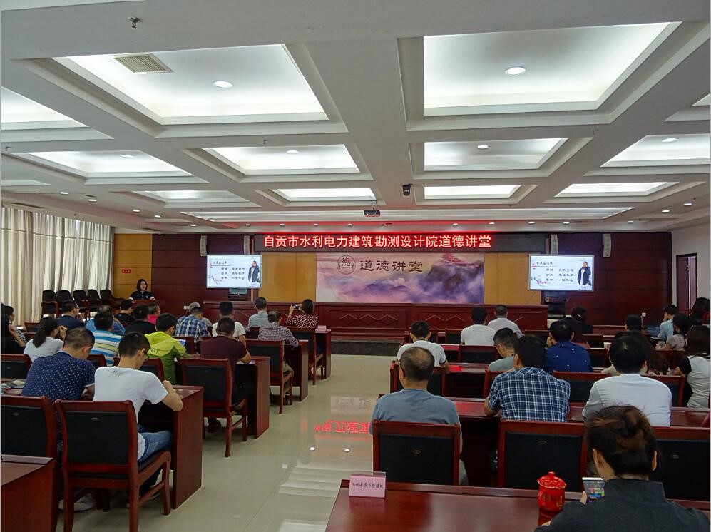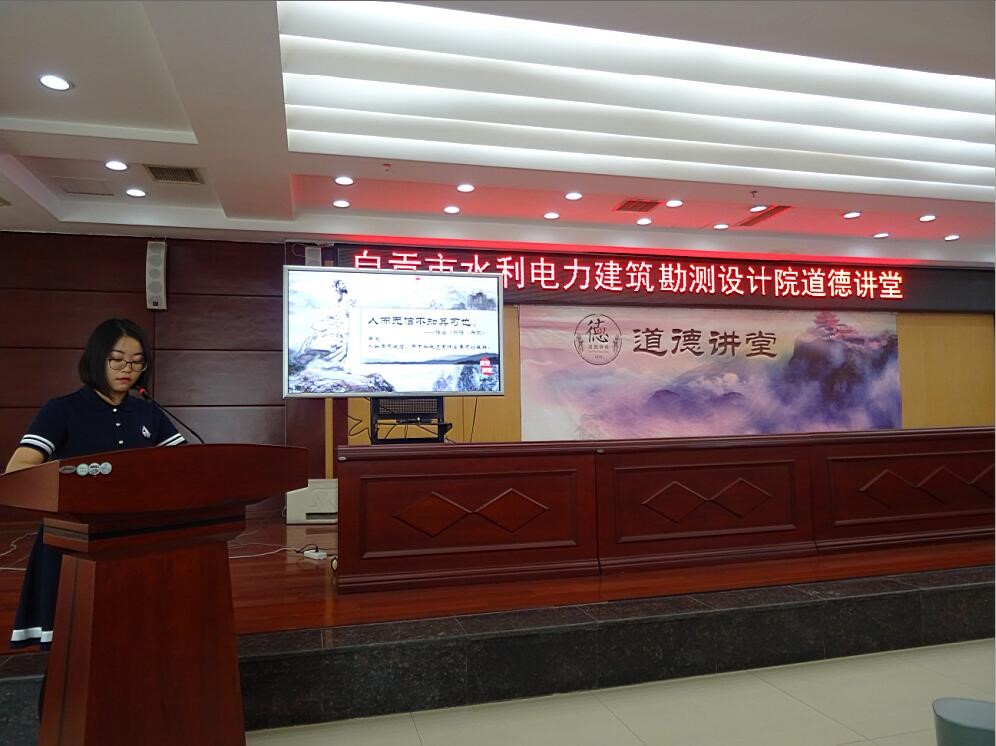 9月28日下午,我院举办了“诚信·友善”为主题的道德讲堂活动。本次道德讲堂内容丰富,共有唱歌曲、诵经典、学模范、发善心等几个环节。活动在全体职工齐唱《公民道德歌》的歌声中拉开序幕。在诵经典环节,主持人解读了“诚者,天之道也;思诚者,人之道也!”、“人而无信不知其可也”这两句诚信经典,并带领大家集体朗诵诚信经典诗词;在接下来的学模范环节中,大家共同观看了中国铁建第四届道德模范于长彬的事迹报道和自贡市第四届道德模范陈昌国的视频故事,我院环境移民室主任彭学彬也上台分享了他在工作中诚信服务于业主的心得。在发善心环节,我院总工室主任张继宇、经营室职工李柯宇分别发表了自己在工作和生活中有关诚信和友善的感言;地勘队王铸同志分享了他编辑的我院地勘队在西藏尼木县帕古水库工地现场工作时的小视频《勘探者之歌》,观看了这段小视频,大家都被他们工作第一、信誉至上、乐观积极、吃苦耐劳的精神所感染。活动最后在《中国中国鲜红的太阳永不落》歌声中结束。